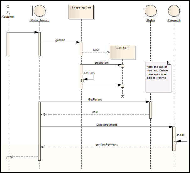 이 예는 순차 다이어그램의 여러 요소를 보여준다.
