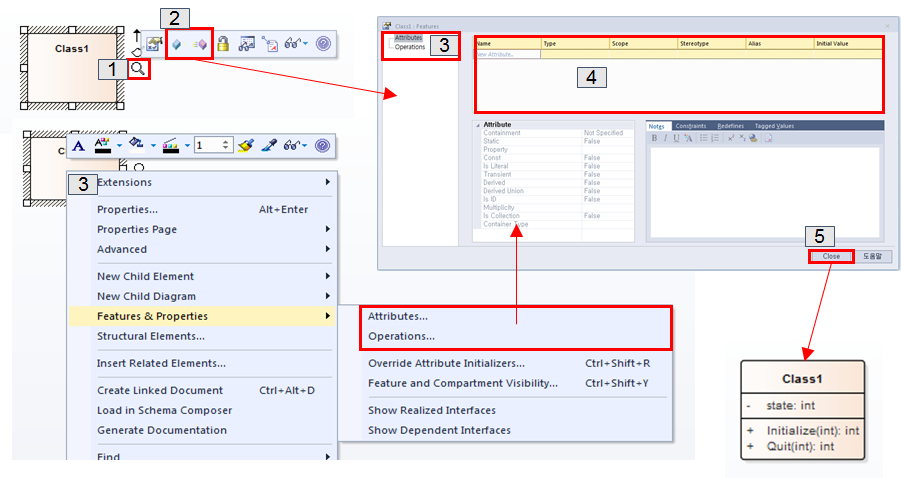 [3] Diagram elment 우 클릭 -> Features & Properties -> Attributes... 또는 Operations... 선택