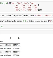 * 'A' 컬럼의 문자인 'bar'와 'foo'로 그룹화되고 각 그룹화에 'B' 컬럼의 문자인 'one', 'two', 'three'가 그룹화된 것을 볼 수 있고,